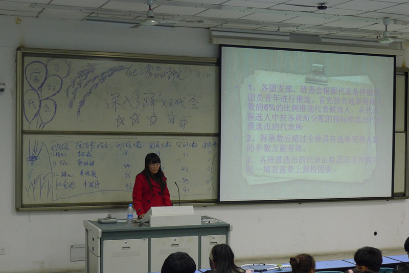 大约在5点45分左右各班的人数都已基本到齐,由于大一第一次上团课,所以大一的主讲人暂时由大二学生主讲,大二的由本班团支书主讲,首先主讲人向同学们详细的解说了“双代会”的意义及内容,以及我们可以行使的权利和需要履行的义务。深入浅出的解释了各个同学的提问,现场气氛热烈而严肃,赢得了同学们的阵阵掌声,整个主讲过程主讲人利用幻灯片形象生动的将内容向同学们展示了出来,在七点半的时候,团课得到了圆满结束。